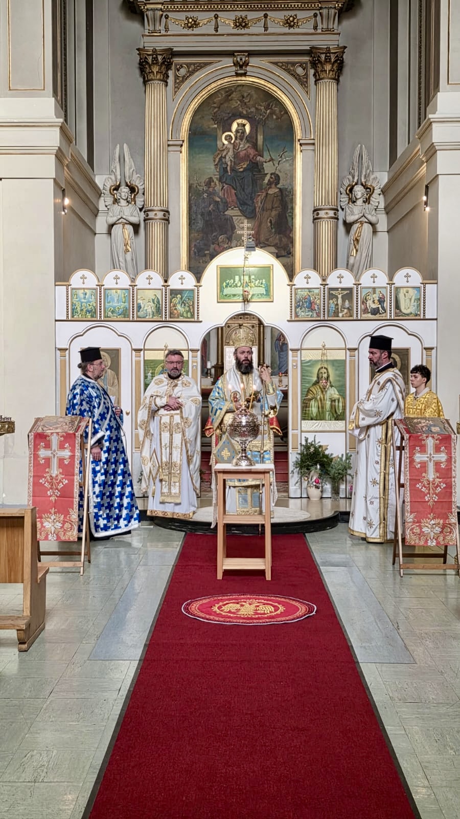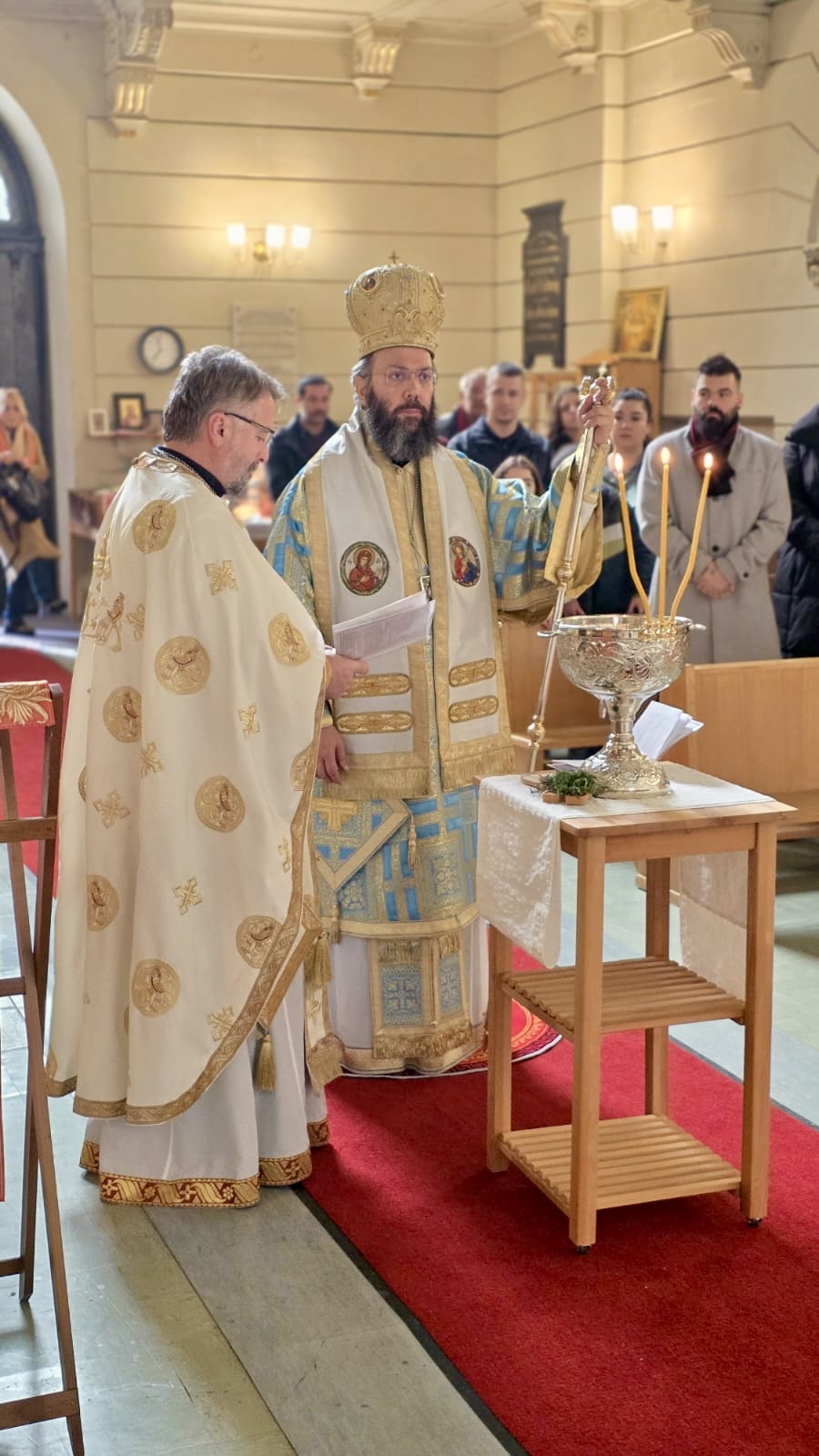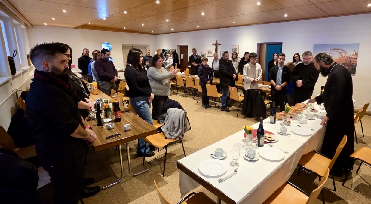 Nach dem Ende der Göttlichen Liturgie wurde die Große Wasserweihe zelebriert, gefolgt von einem Treffen im Gemeindezentrum, wo Seine Eminenz die Vasilopita segnete und Wünsche mit den Gläubigen austauschte. Das Fest klang mit einem festlichen Mahl aus, an dem Seine Eminenz und alle Gläubigen in einer Atmosphäre der Freude und Einheit teilnahmen.