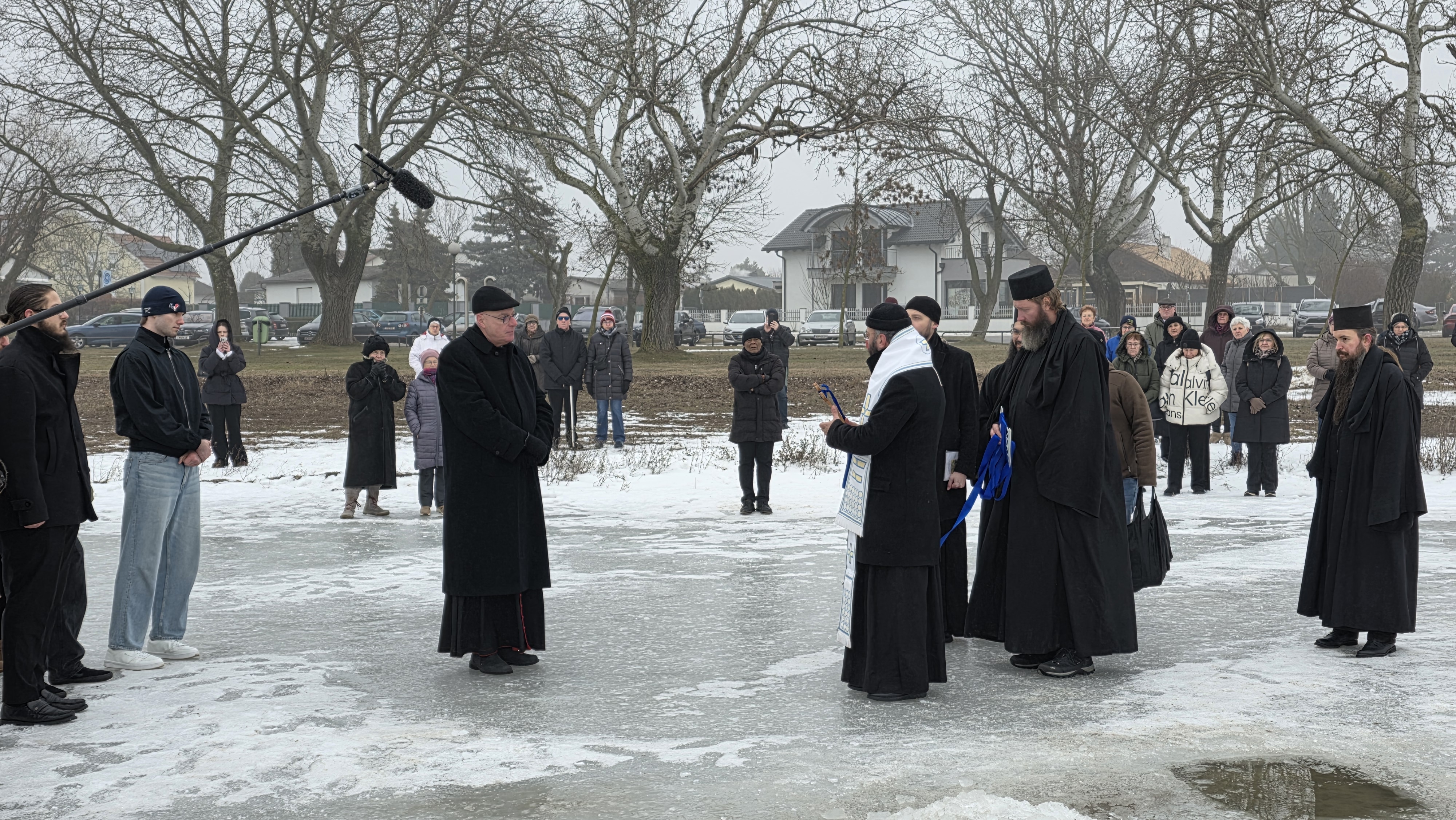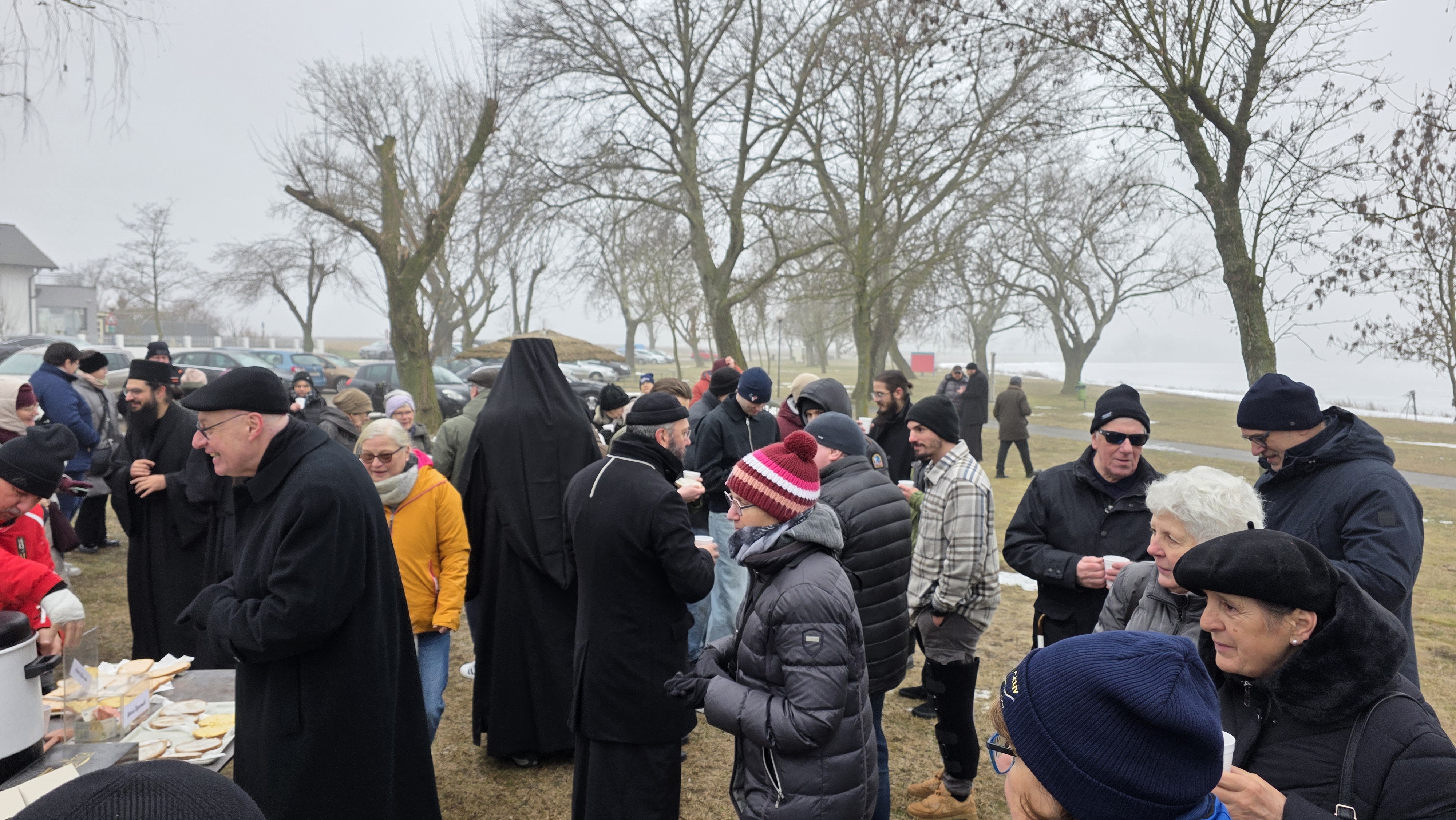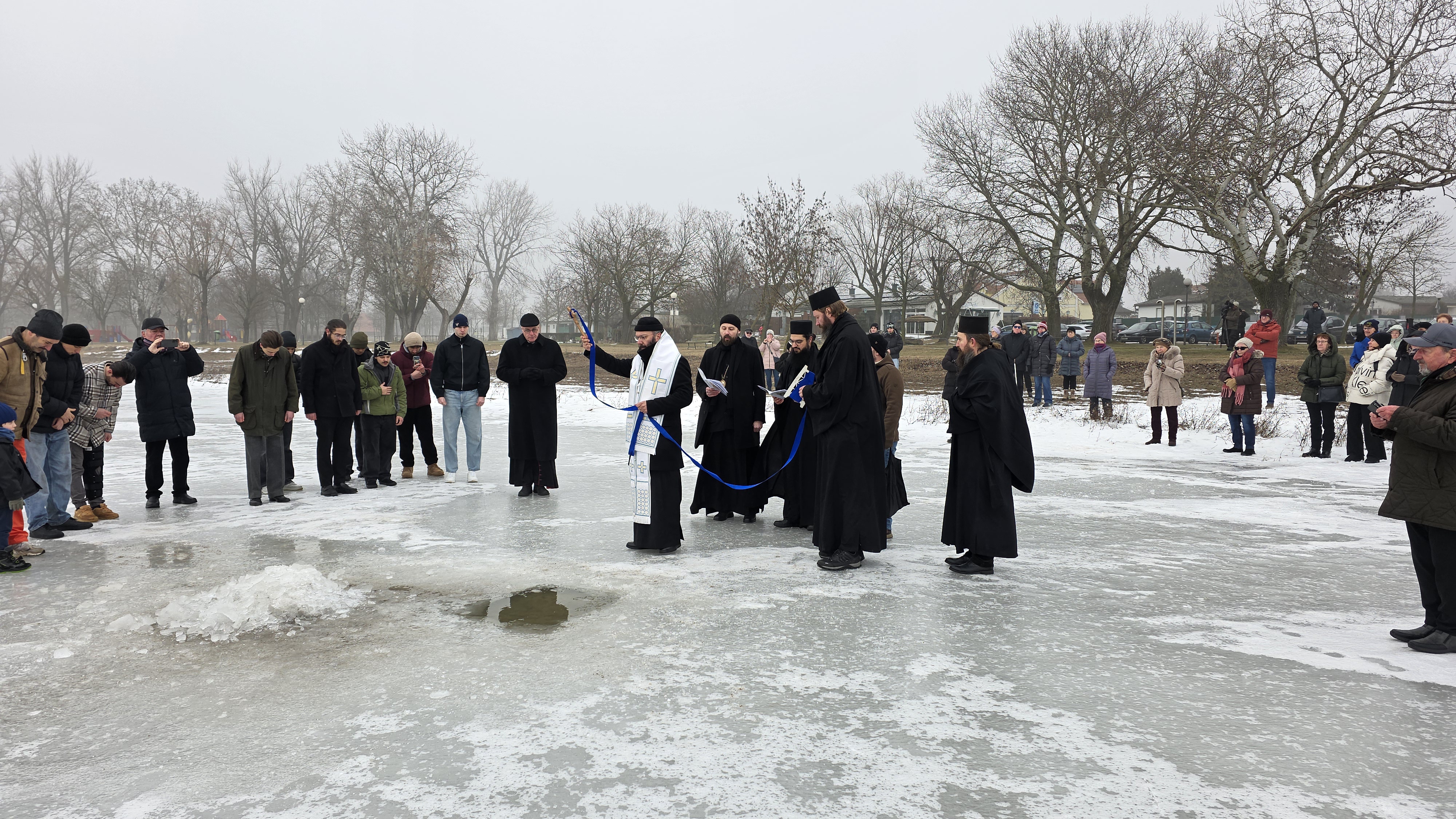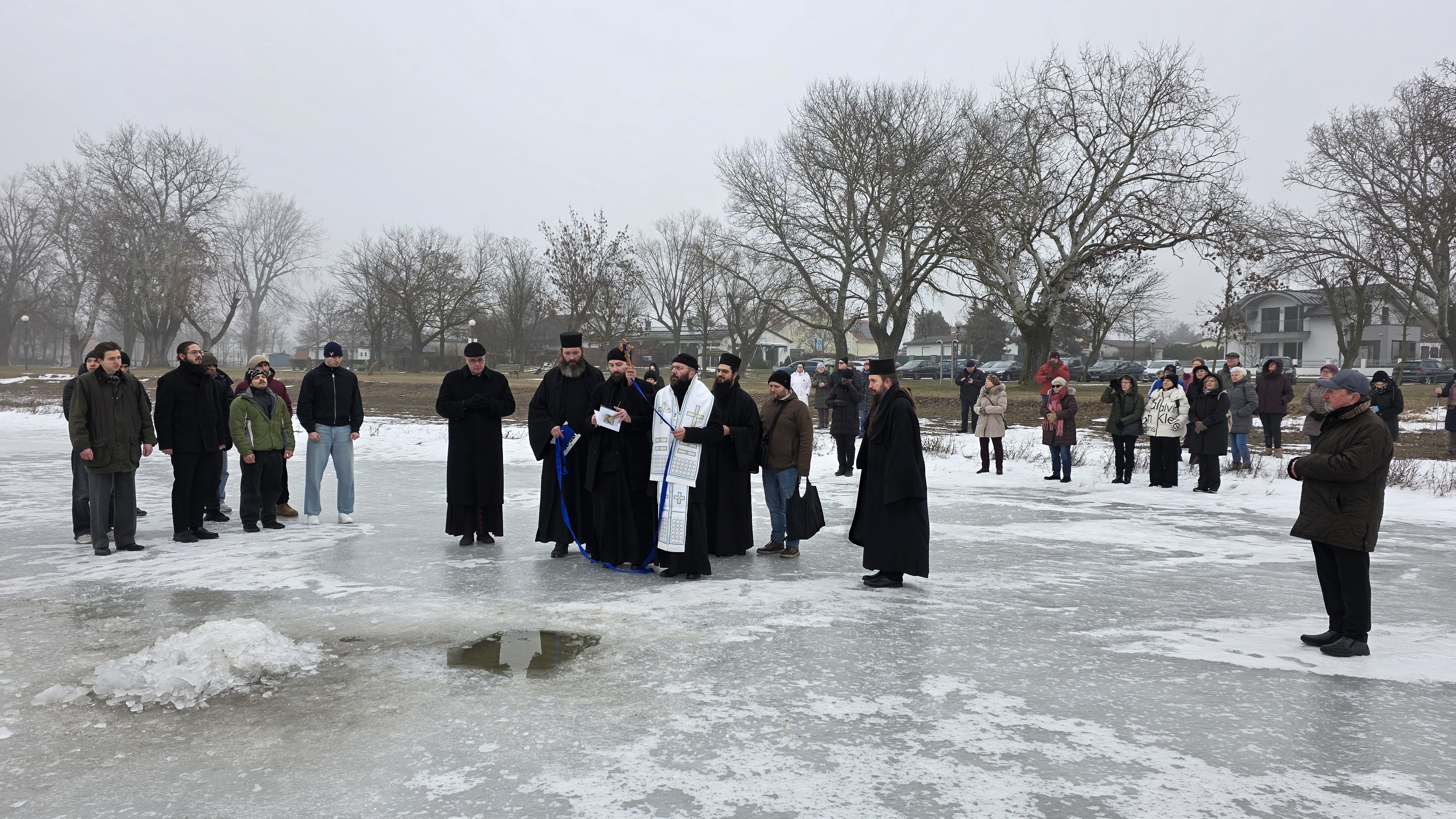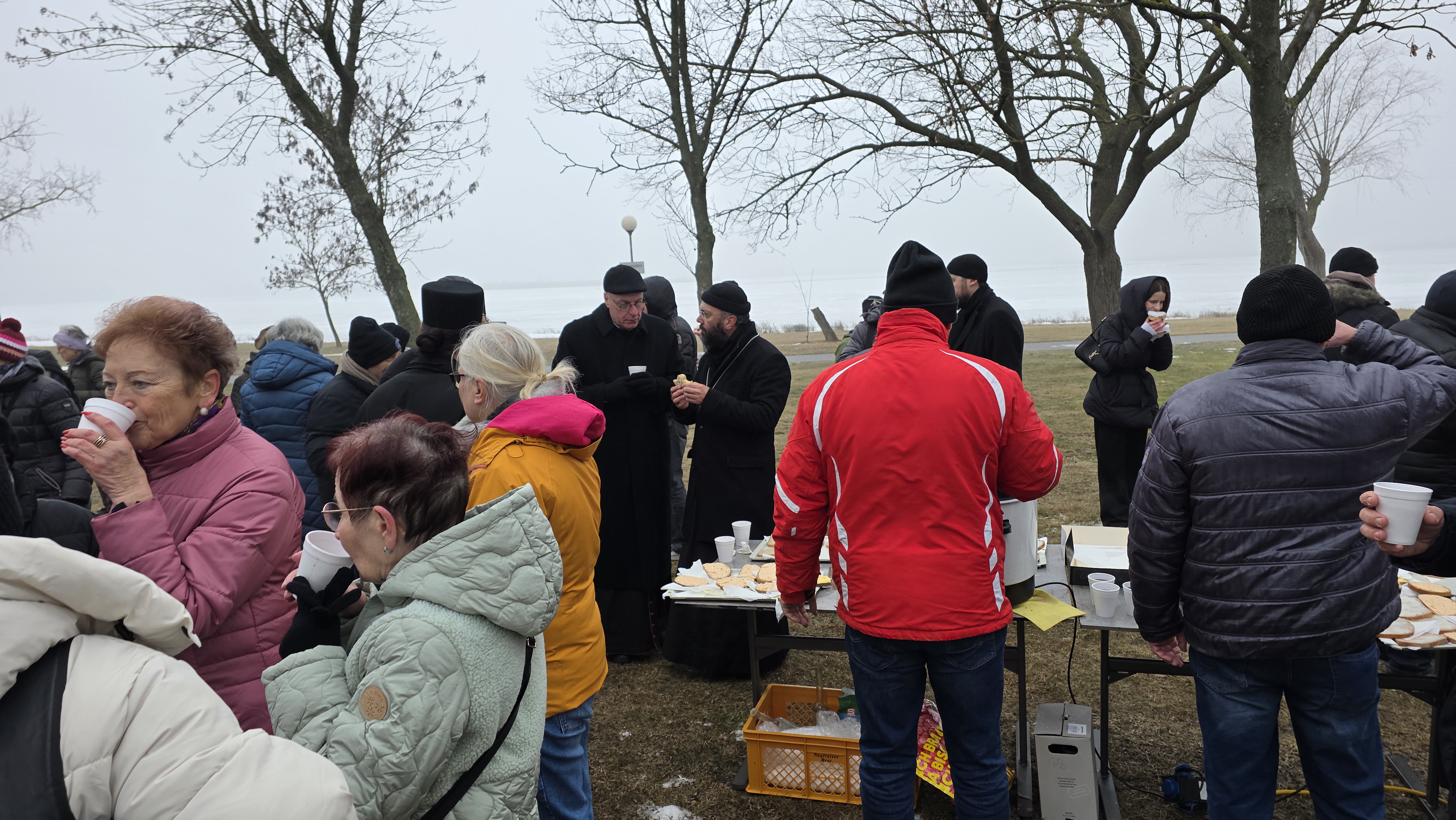 Nach dem Ende der Göttlichen Liturgie zogen Seine Eminenz mit Seiner Exzellenz, den Vätern des Klosters und den Gläubigen der Region zum Zicksee, wo die Wasserweihe vollzogen wurde. Bei der Wasserweihe war auch der römisch-katholische Bischof von Eisenstadt, S.E. Ägidius Zsifkovics, zugegen, der seinerseits allen ein gutes neues Jahr wünschte und seinen Wunsch nach einer Fortsetzung der guten Zusammenarbeit mit der Griechisch-Orthodoxen Metropolie von Austria und dem Kloster Maria Schutz und des Hl. Paisios zum Ausdruck brachte. Seine Eminenz dankte dem Bischof für seine Anwesenheit sowie für den brüderlichen Weg und richtete seine Wünsche an alle Anwesenden. Im Anschluss wurde allen Teilnehmern in einem Geist der Liebe und des Miteinanders eine Bewirtung angeboten.