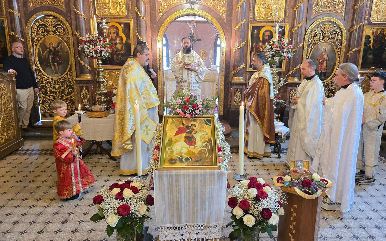 In seiner Predigt erinnerte Metropolit Arsenios an die Botschaft der Auferstehung und lud alle Gläubigen ein, dem Licht und nicht der Finsternis zu folgen und an der Freude der Kirche teilzuhaben. Sie verkündet uns den Übergang in das wahre Leben. Wir sollen die Freude nicht nur an den Bräuchen, sondern auch an der ontologischen Bedeutung des Ereignisses der Auferstehung teilhaben lassen. Der Tag war dem heiligen und ruhmreichen Großmärtyrer Georg dem Trophäenträger gewidmet, dem Patron der ältesten orthodoxen Bruderschaft in Wien. Der Metropolit sprach über die ikonographischen Darstellungen des heiligen Georgs, die manchmal die Wunder erzählen, die fromme Christen dem Heiligen zuschreiben. Sie wenden sich an ihn in der Hoffnung auf seine Fürsprache beim Herrn. „Georg ist einer der ältesten Heiligen der Kirche und ihrer Märtyrer und zugleich ein Vorbild der Hingabe an den auferstandenen Christus. Heute, im Gedenken an sein Martyrium, müssen wir seinem Beispiel folgen. Er blieb in Selbstverleugnung seinem Glauben treu und empfing die Krone des Martyriums.“
