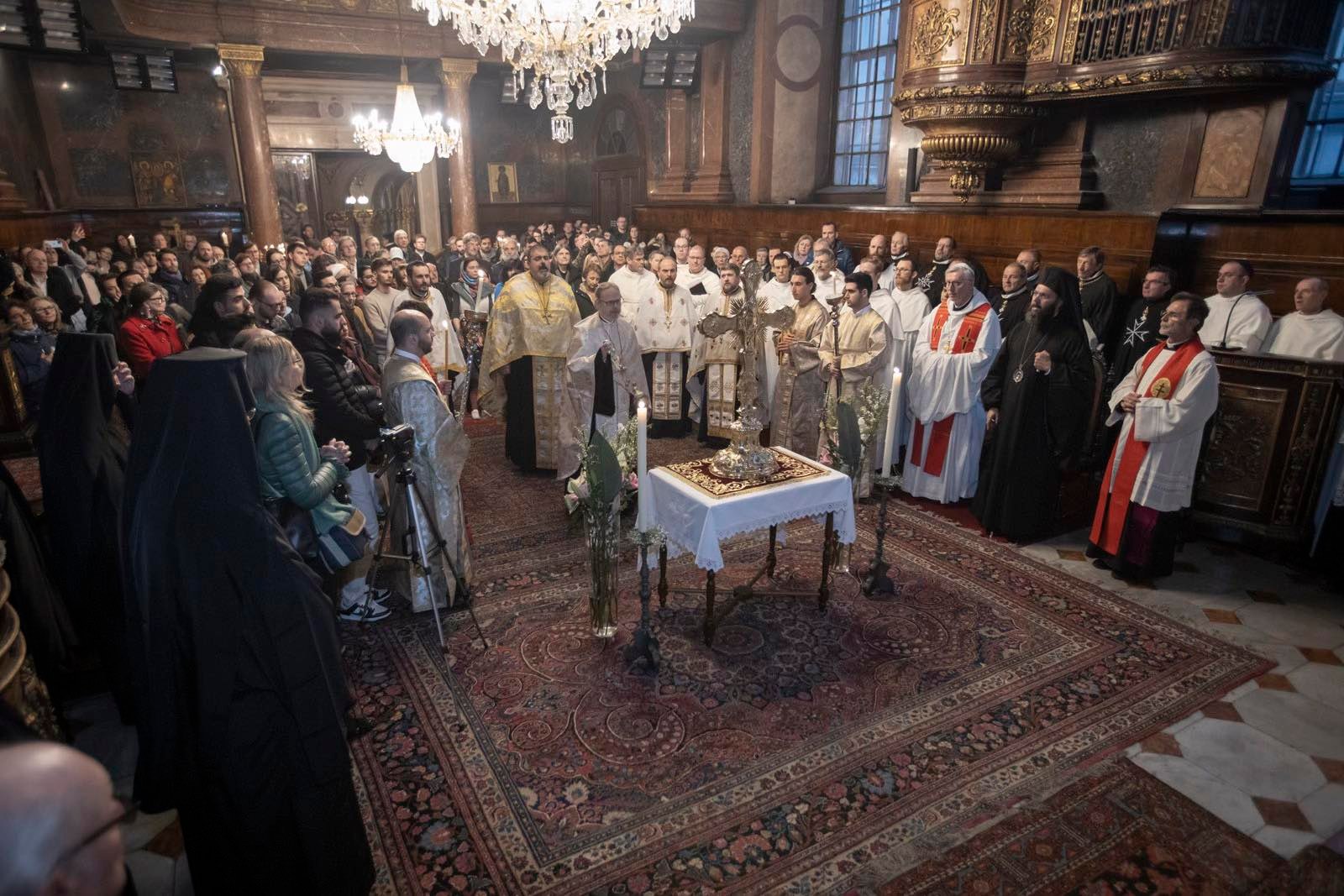 Am Samstag, dem 22. März 2025, wurde die Kreuzreliquie von der Bernadikapelle im Heiligenkreuzhof in einer Prozession in die Kathedrale zur Heiligen Dreifaltigkeit übertragen. Seine Eminenz Metropolit Arsenios von Austria zeigte sich sehr dankbar für die brüderlichen Geste und hieß sowohl Abt Maximilian Heim als auch den Wiener Apostolischen Administrator Josef Gründwidl herzlich willkommen. Nach der feierlichen Vesper, bei der die Kreuzreliquie in einer Monstranz in der Mitte der Kathedrale ausgesetzt wurde, fand ein Konzert mit gregorianischen und byzantinischen Hymnen zum Heiligen Kreuz statt. Zahlreiche Christen orthodoxen und katholischen Bekenntnisses nahmen die Gelegenheit wahr, die Kreuzreliquie zu verehren, die zum dritten Mal in der Geschichte die Wiener Innenstadt besuchte.