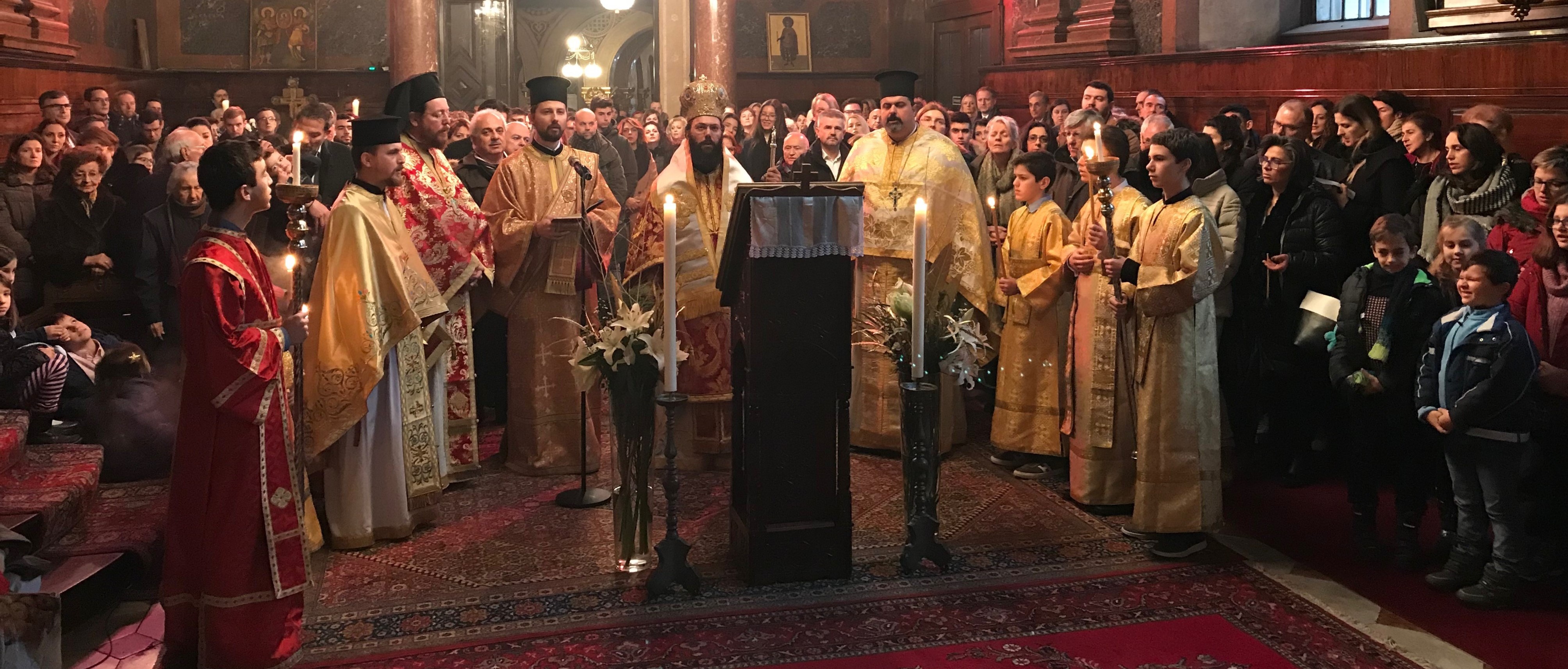 Anlässlich des großen Fest der Geburt und Menschwerdung unseres Herrn, Gottes und Erlösers Jesus Christus wurden in Wien am Morgen des 24. Dezembers 2018 die Großen Stunden und die Göttliche Liturgie in der Kathedrale zur Hl. Dreifaltigkeit gefeiert. Am Abend des 24. Dezembers, um 22.00 Uhr, zelebrierte Metropolit Arsenios gemeinsam mit dem in Wien zu Gast weilenden Archimandriten Nikifor Milovic, dem Bischofsvikar und Erzpriester des Ökumenischen Thrones Ioannis Nikolitsis, Priester Yuriy Strugov und Diakon Maximos die große Vesper und die Göttliche Liturgie des Hl. Basilios des Großen. Am 25. Dezember folgte die Feier des Orthros und der Göttlichen Liturgie des Heiligen Johannes Chrysostomos.